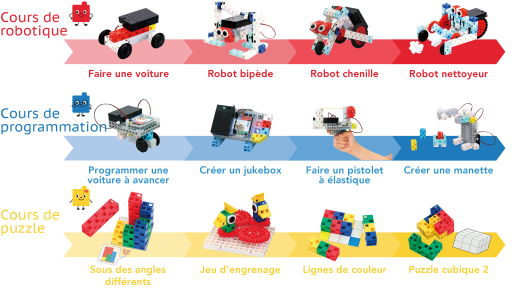 Le cursus est divisé en trois parties sur 2 ans (à suivre en entier ou en partie) : puzzles 3D, robotique et programmation de robots.