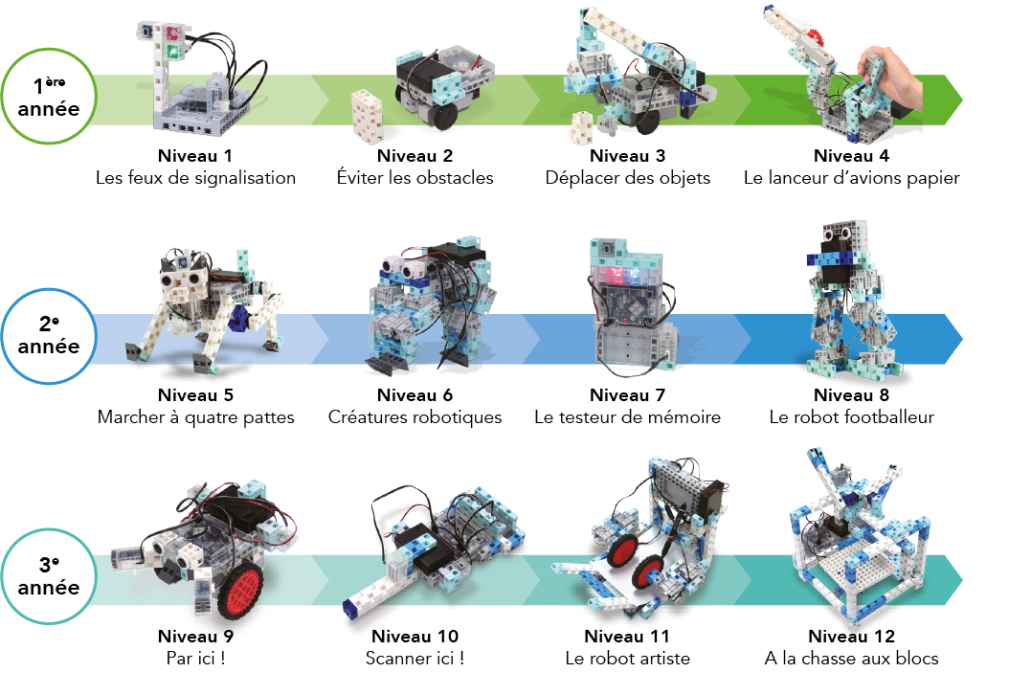 Le cursus de 3 ans (à suivre en entier ou en partie) comporte 12 niveaux permettant à l’enfant d’apprendre à construire plus de 36 robots.